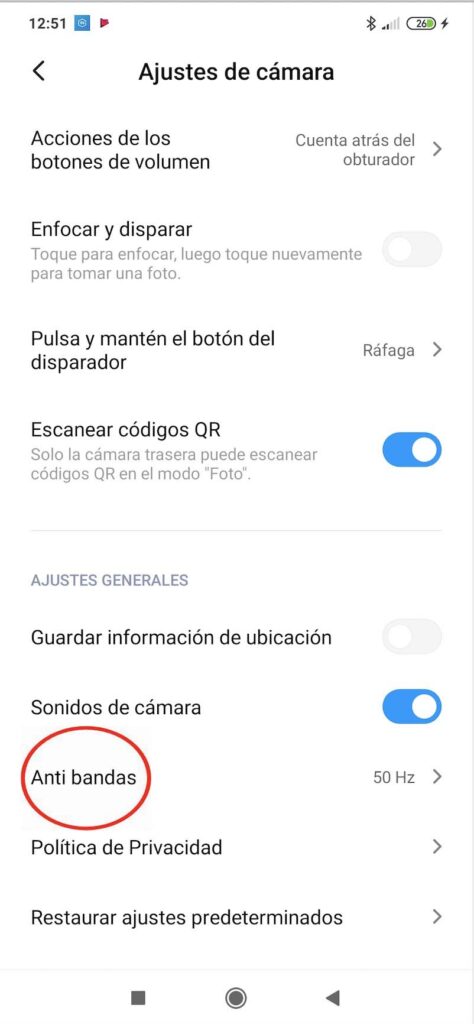 Se activa de forma sencilla a través de los ajustes de la cámara de tu móvil. Te aparecerá la opción “Antibandas”, la cual deberás activar.
