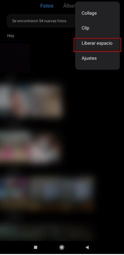 Al acceder a tu galería, ubicarás arriba y a la derecha los tres puntos verticales del menú. Pulsa sobre él y elige “Liberar espacio”. En pocos segundos escaneará todo el contenido que puedes administrar.
