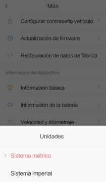 Aquí tendremos las vista general. Podemos ir a los ajustes, donde veremos las opciones para configurar el sistema métrico o buscar actualizaciones del Firmware de nuestro patín.