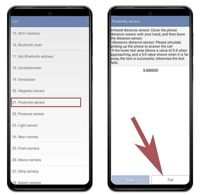 - Tapa el sensor de proximidad con tu dedo hasta que el valor «5» de Proximity sensor test se ponga a 0.
