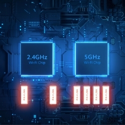 - Wi-Fi 5 G: 4 × 4 (compatible con hasta el protocolo IEEE 802.11ax, velocidad máxima teórica de 2402 Mbps)